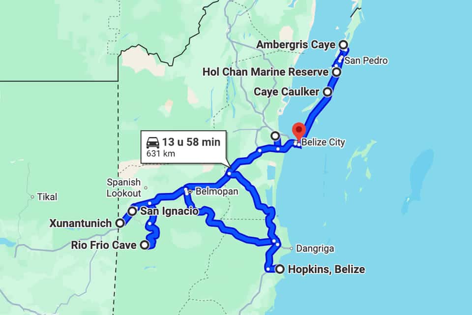 🚐 Afstand Belize City → San Ignacio: ca. 115 km (2 – 2,5 uur), San Ignacio → Rio Frio Cave: ca. 40 km (1 uur)