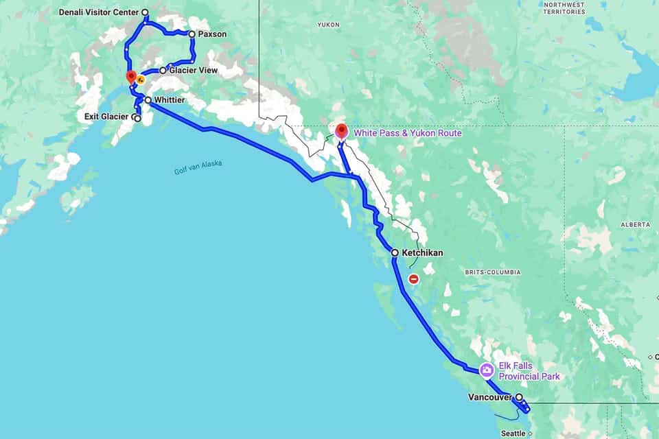 LET OP: Dit is slechts een voorbeeldreis. Er zijn meerdere routes mogelijk. En natuurljk kun je ook alleen een reis maken met een huurauto of alleen een cruise doen. Wil jij Alaska op de juiste manier bezoeken? Ik geef je gratis een reisadvies op maat. Vul dit formulier op Droomplekken.nl in en ik help je met het regelen van jouw perfecte reis.